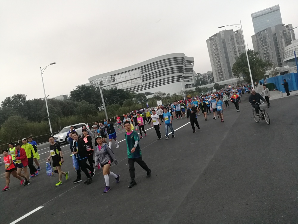 當(dāng)天早上六點(diǎn)半,報(bào)名參加歡樂跑以及半程馬拉松的23位同事整裝待發(fā),一起乘坐中巴前往黃埔體育館。盡管當(dāng)天氣溫較前一天有點(diǎn)低,甚至下起了小雨,但是大家依然熱情高漲,一路上有說有笑,好不熱鬧。八點(diǎn)整,開跑槍聲準(zhǔn)時(shí)響起,場內(nèi)頓時(shí)沸騰起來。